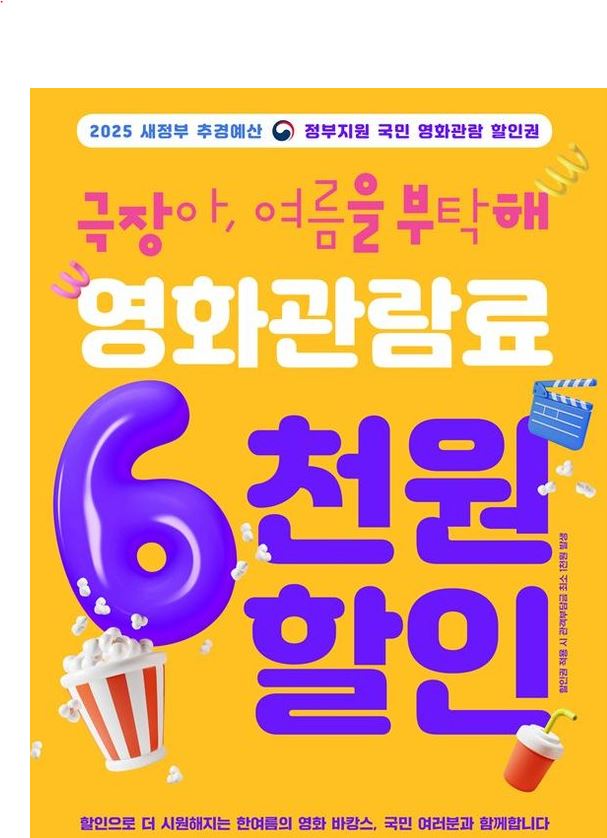 문화체육관광부가 2025년 여름을 맞아 전 국민에게 영화관 할인 쿠폰을 무료로 지급합니다. 1인당 6,000원 할인권 2장씩 총 450만 장이 배포되며, 7월 25일(목) 오전 10시부터 선착순으로 지급됩니다.