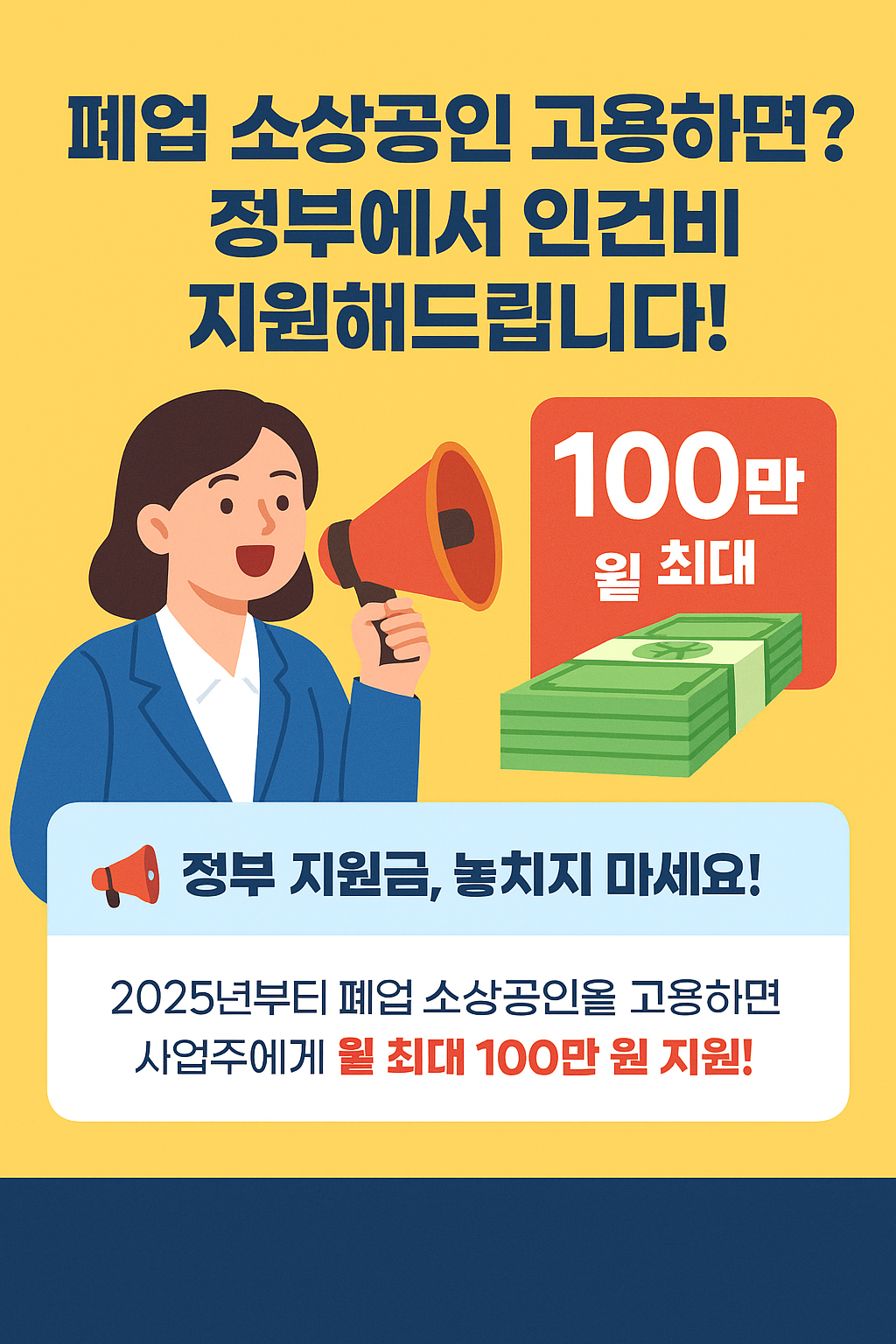 2025년, 정부는 폐업한 소상공인의 재취업을 돕고 고용 시장을 활성화하기 위해 ‘폐업 소상공인 고용장려금’ 제도를 새롭게 시행합니다. 이 제도는 폐업 소상공인을 정규직으로 고용한 사업주에게 최대 1년간 월 100만 원의 인건비를 지원하는 정책입니다.